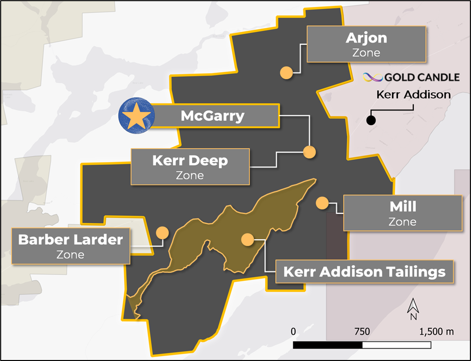 The McGarry Project is a past-producing gold property located approximately 10 km east of Larder Lake, Ontario, within the Abitibi Greenstone Belt along the Larder Lake-Cadillac Deformation Zone (“LLCDZ”), one of Canada’s most prolific gold-bearing structures. The property is immediately adjacent to the historic Kerr-Addison Mine and benefits from a setting long recognized as fertile for major gold systems.